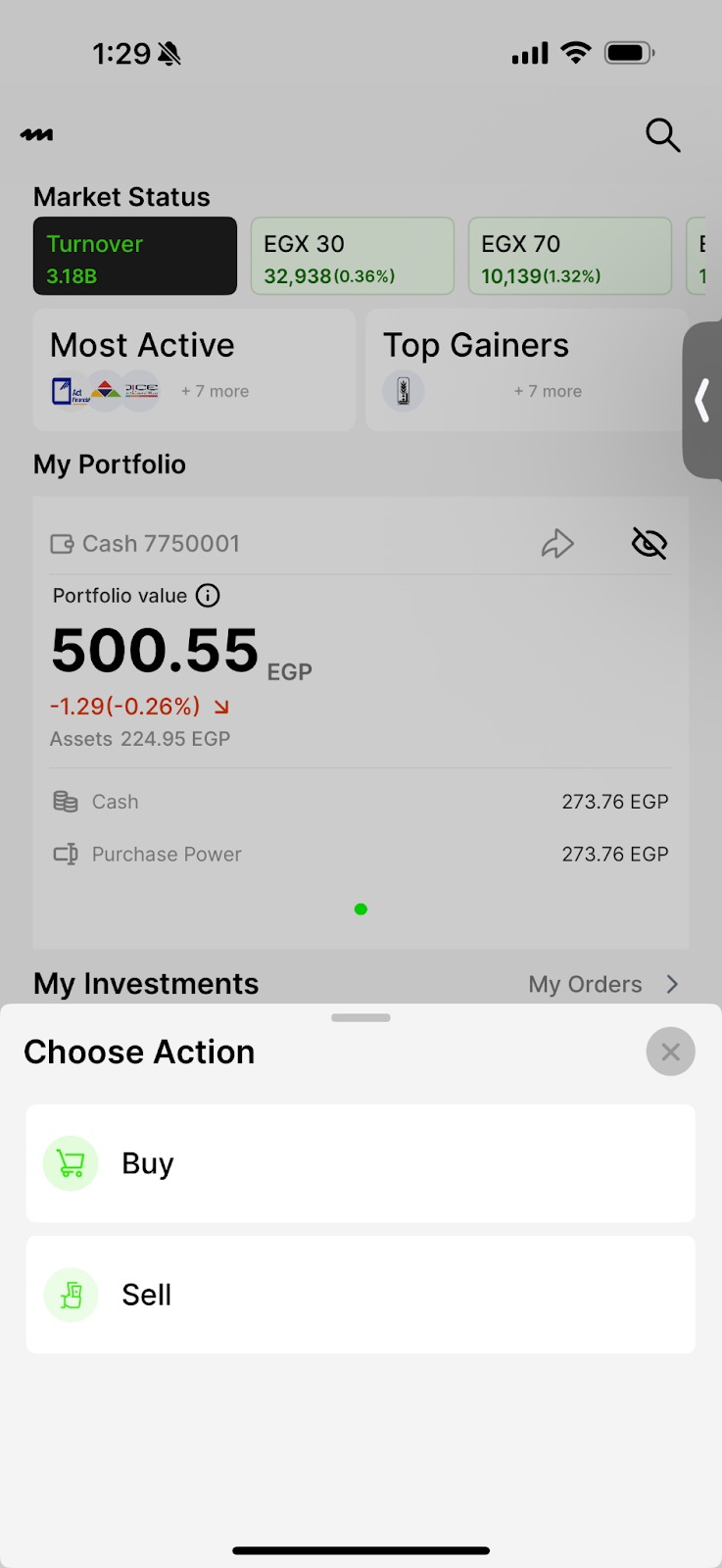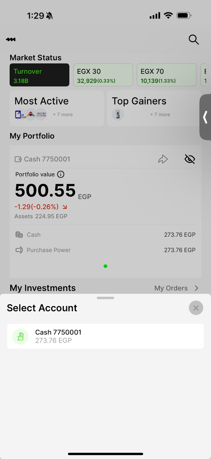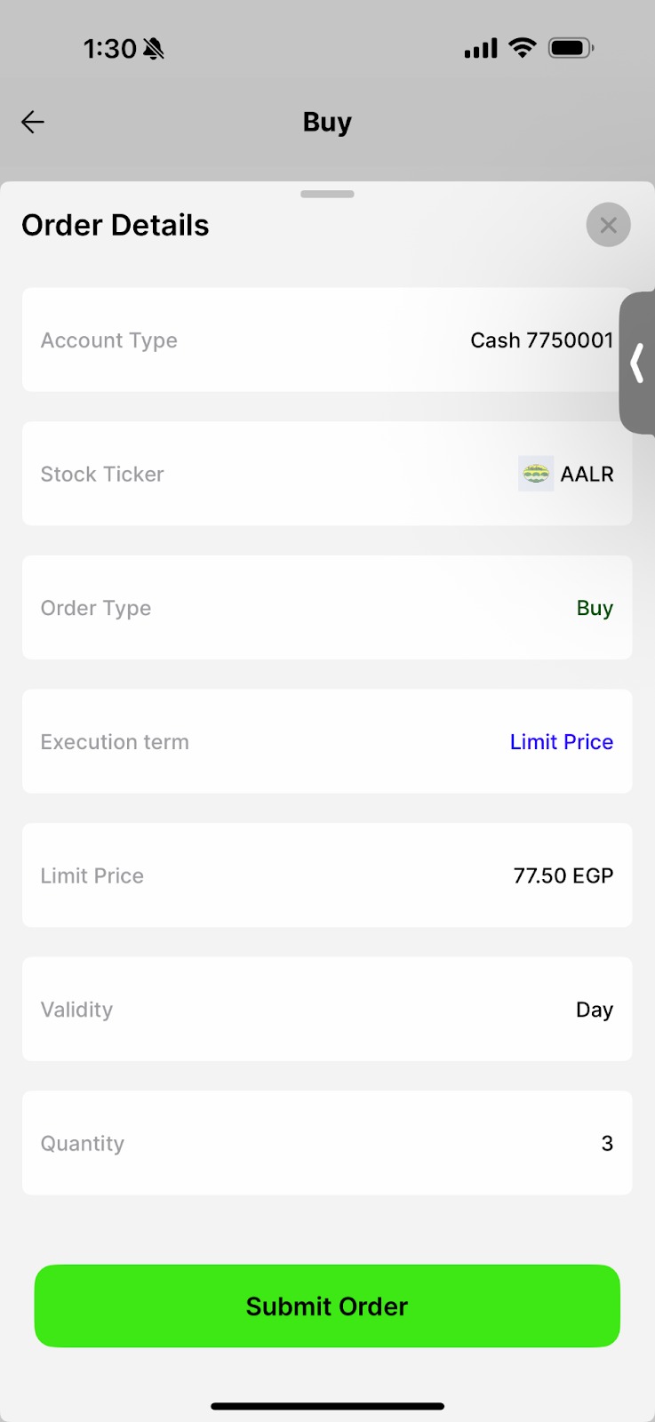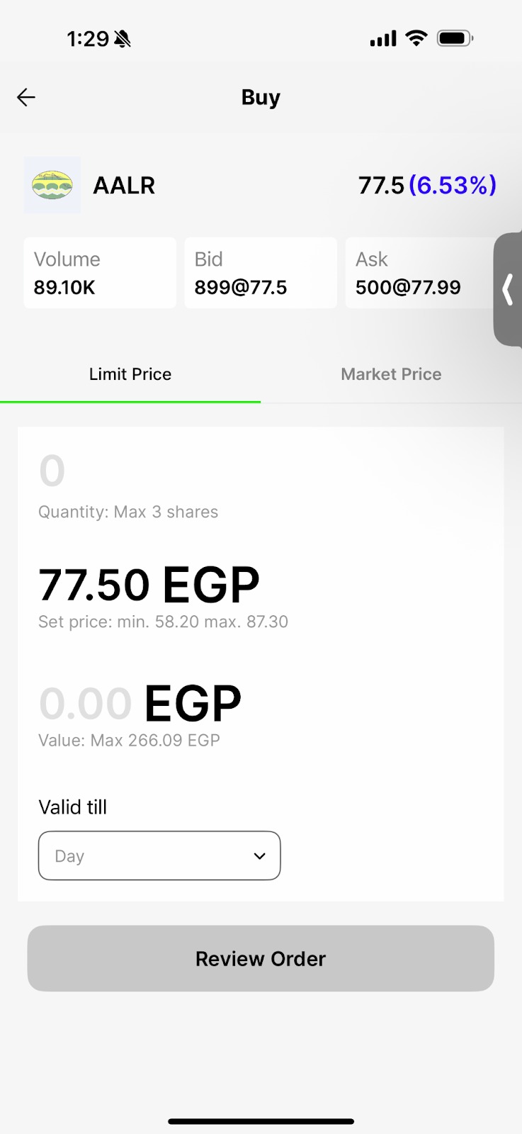 Example: if a stock is currently trading at 50 egp and you place a limit order at 48 egp, your order will only go through if the stock price drops to 48 egp.